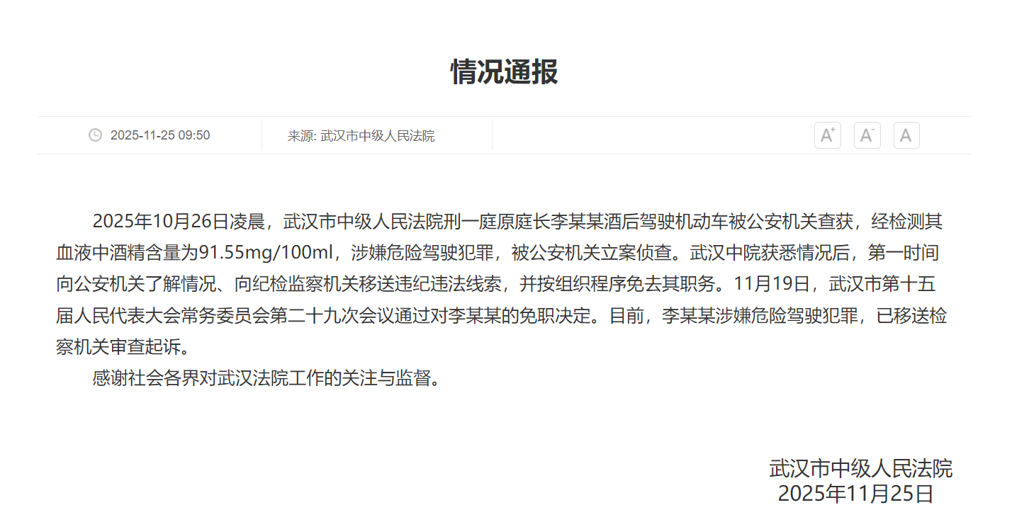 2025年10月26日凌晨,武汉市中级人民法院刑一庭原庭长李某某酒后驾驶机动车被公安机关查获,经检测其血液中酒精含量为91.55mg/100ml,涉嫌危险驾驶犯罪,被公安机关立案侦查。武汉中院获悉情况后,第一时间向公安机关了解情况、向纪检监察机关移送违纪违法线索,并按组织程序免去其职务。11月19日,武汉市第十五届人民代表大会常务委员会第二十九次会议通过对李某某的免职决定。目前,李某某涉嫌危险驾驶犯罪,已移送检察机关审查起诉。
